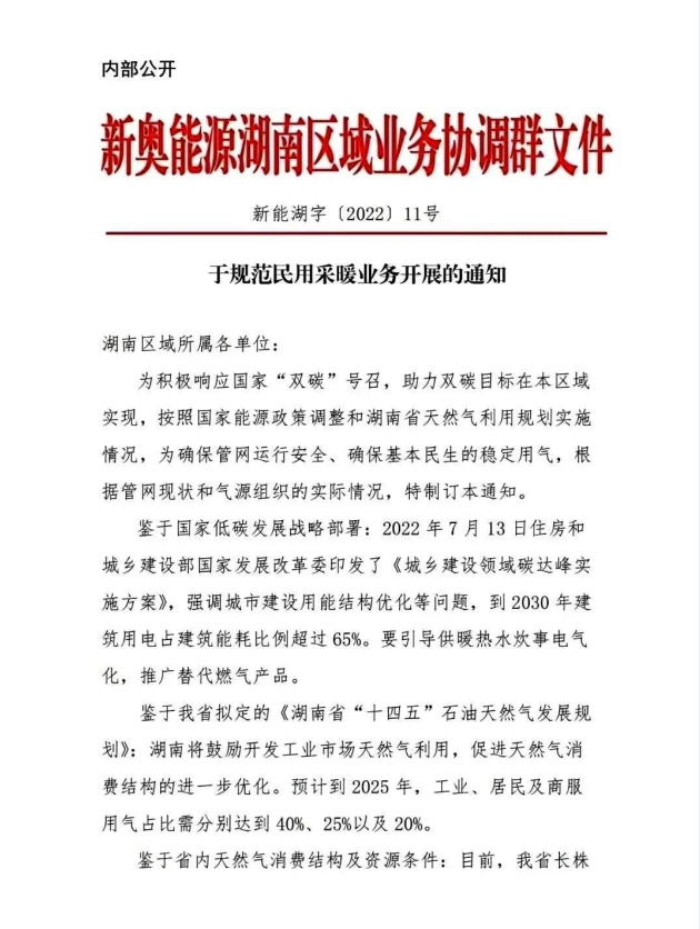 除此之外,不久前新奥能源湖南区域业务协调群发布了《关于规范居民采暖业务开展的通知》,明确提出:原则上停止所有零散用户采暖通气、连接采暖炉等业务。